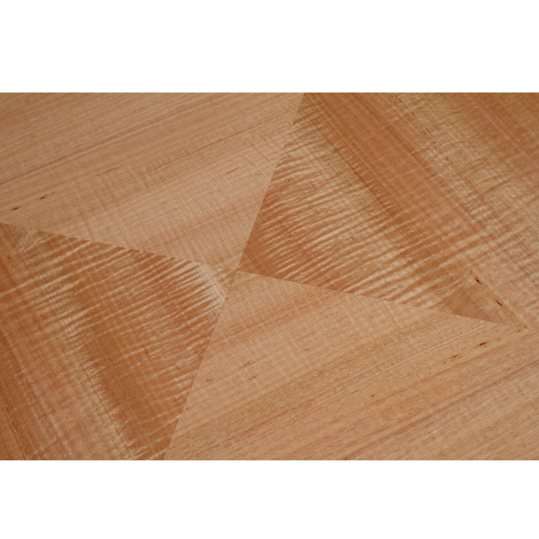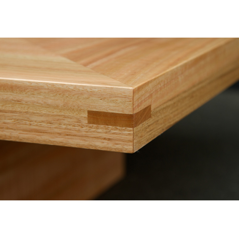 A simple square coffee table, which features a quarter matched Fiddleback Eucalypt center panel surrounded by a solid timber edge with 'keyed' miter joints.