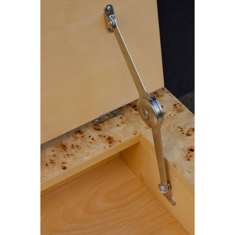 This Hi-Fi cabinet has a lift up top with a section to house a turntable. Hi-Fi components are accommodated on adjustable shelves behind retractable, push to open doors.